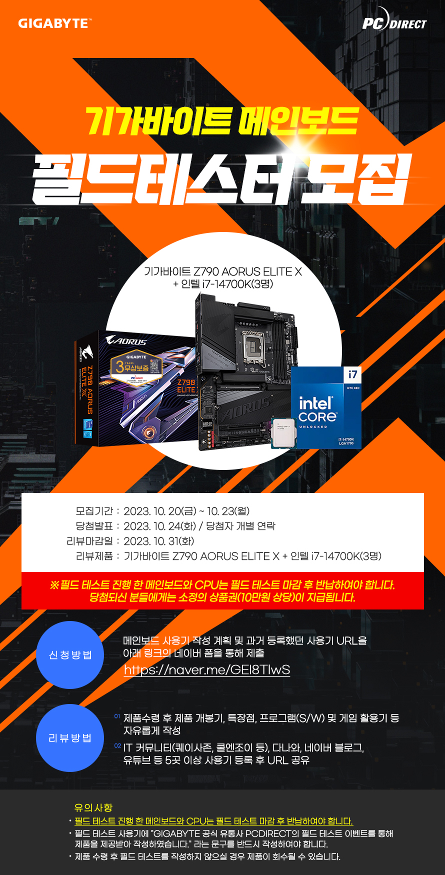 - 필드 테스트 사용기에 'GIGABYTE 공식 유통사 PCDIRECT의 필드 테스트 이벤트를 통해 제품을 제공받아 작성하였습니다.'라는 문구를 반드시 작성하여야 합니다.